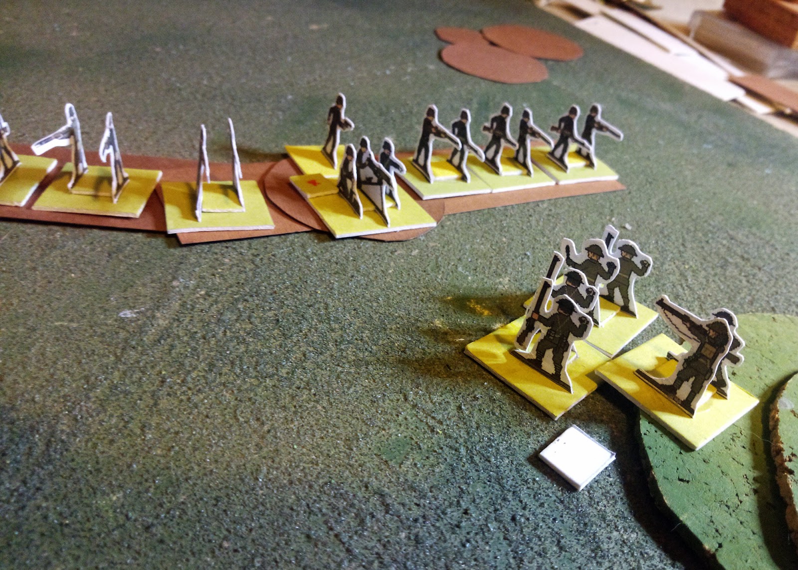 I used a method of dicing for figure setup I've used before; roll a D6 for each side and whichever side rolled the lowest had to set up that many figures in their half of the field. You keep rolling until one side has placed all their figures, at which point the other player places what they have left. The first player to position figures is counted as the defender.