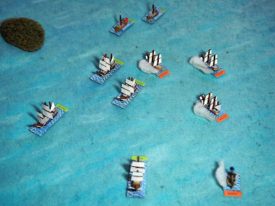 This was a tough, and frustrating, battle for both sides. The Dutch gunnery is potentially good, but the Portuguese ships are tough and difficult to damage. However their ability to activate is abysmal, and they turn very slowly. A good job as if they can fire at a decently short range their gunnery is potentially devastating. The fustas were unexpectedly good; despite their low combat value they could give the Dutch ship a run for their money in a boarding action and if two could have teamed up on one Dutch ship they would have taken it quickly and easily.