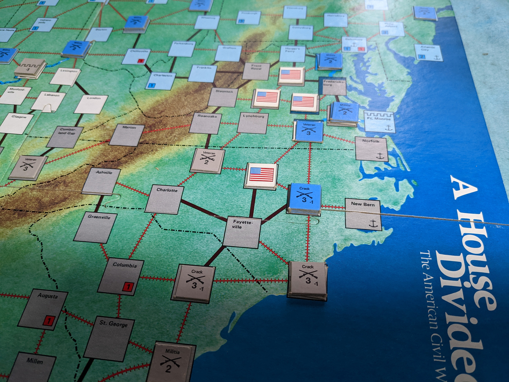 'A House Divided' is a great game - very simple to play, but tactically quite complicated if you use the supply rules, as both sides are constantly forced to consolidate and protect their gains whilst hoping their opponent doesn't get time to build up strength to take them away. It certainly captures the feel of the conflict as I understand it. It's one downside is that it takes forever to play.