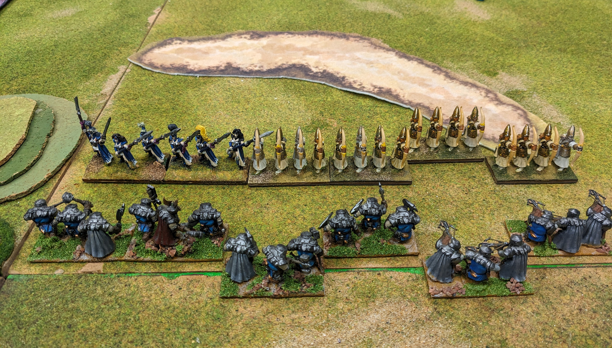 That was a win for me. However we couldn't be bothered setting up the game again, so we pretended it hadn't happened and carried on. Geoff advanced his spear phalanx towards the Dwarven left, held by a couple of elements of knights and a paladin.